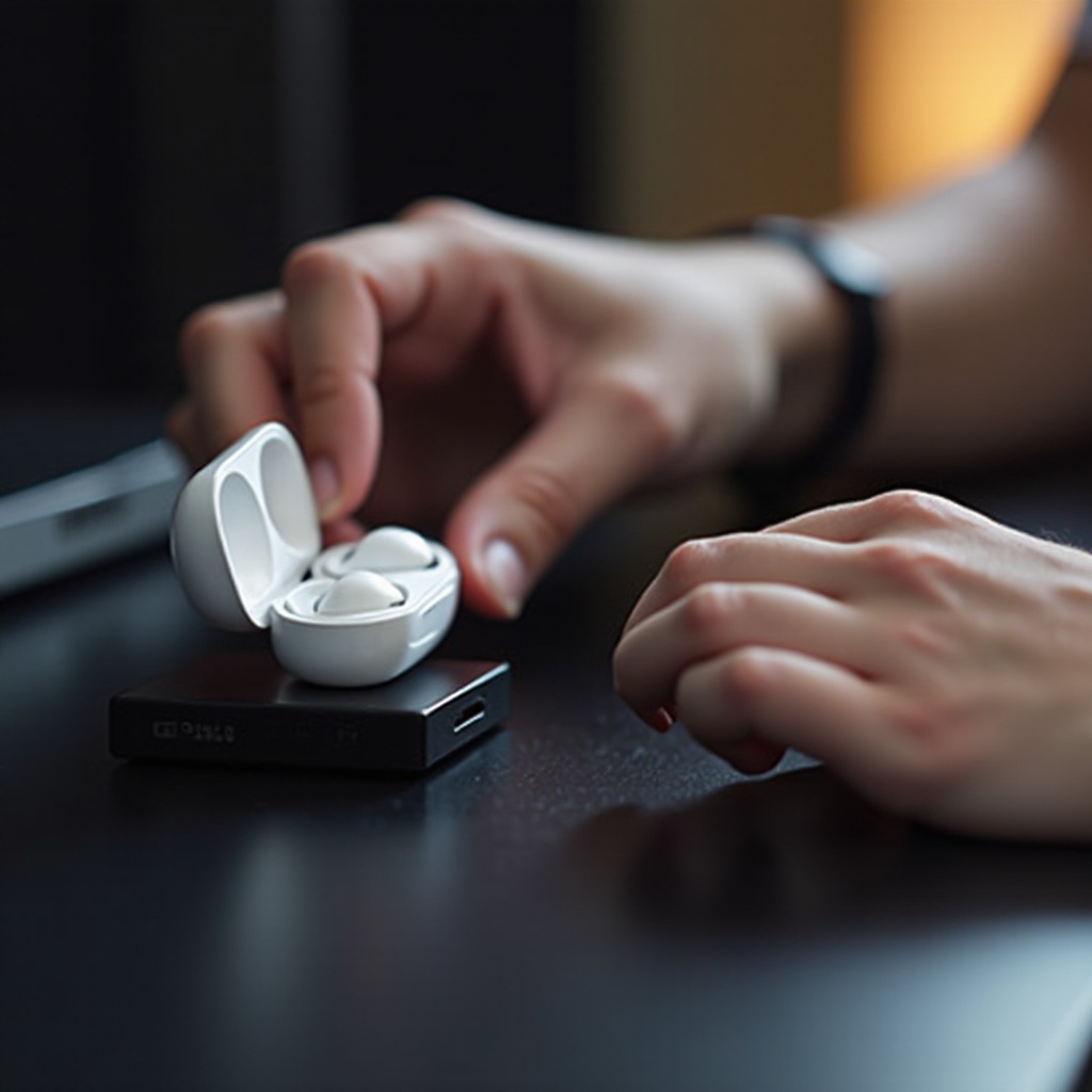 إقران AirPods بمحول البلوتوث: افتح علبة AirPods، مع إبقاء AirPods في الداخل، واضغط على الزر الموجود في الخلف حتى يبدأ مؤشر LED في الوميض باللون الأبيض. يشير هذا إلى أنها في وضع الاقتران. في الوقت نفسه، اضبط محول البلوتوث على وضع الاقتران، عادةً بالضغط على الزر حتى يومض الضوء، وانتظر حتى تتصل الأجهزة.